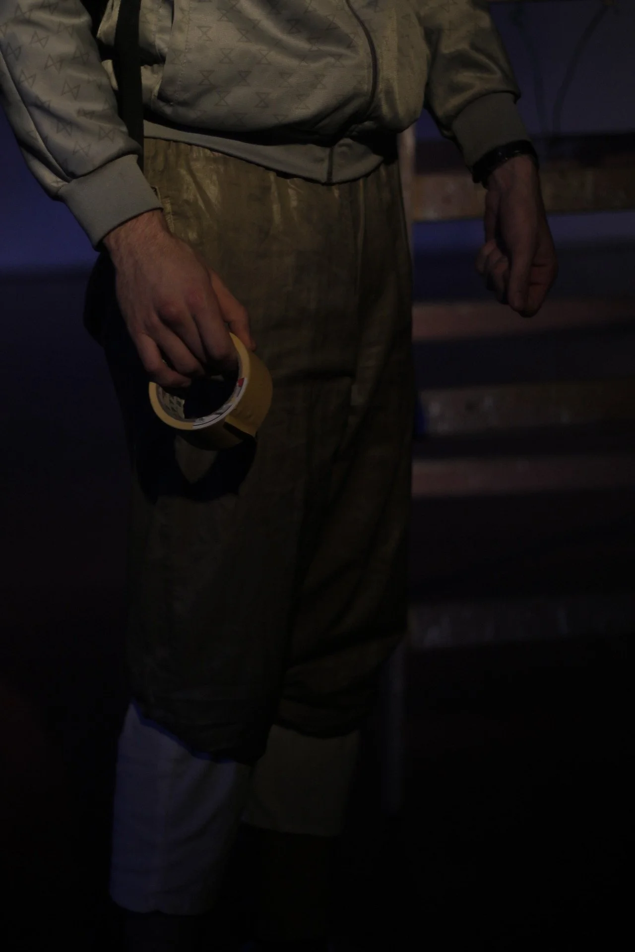 A person holding a roll of yellow masking tape in a dark indoor setting.