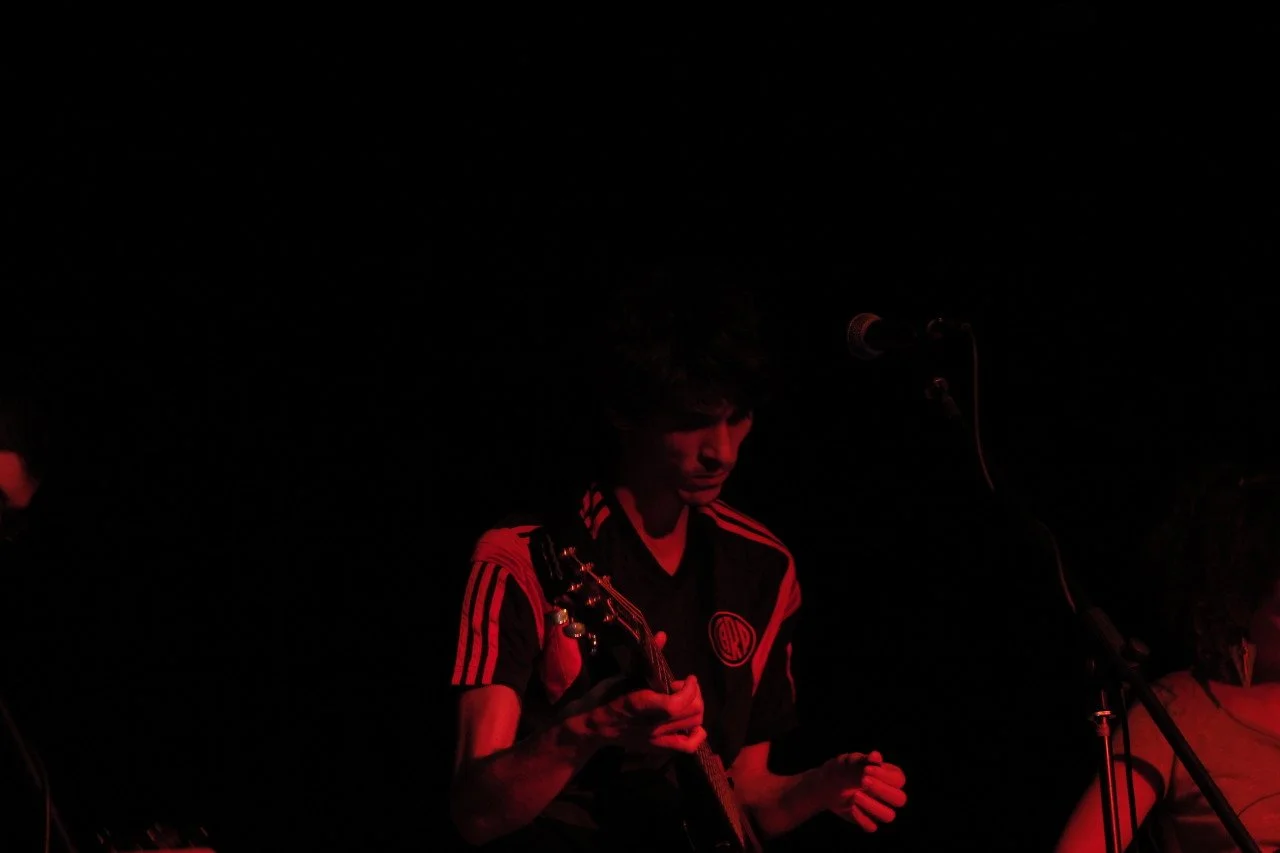 A person standing on a stage near microphone with a guitar pedal at their feet, in a dimly lit music or performance venue, with musical equipment and cables visible.