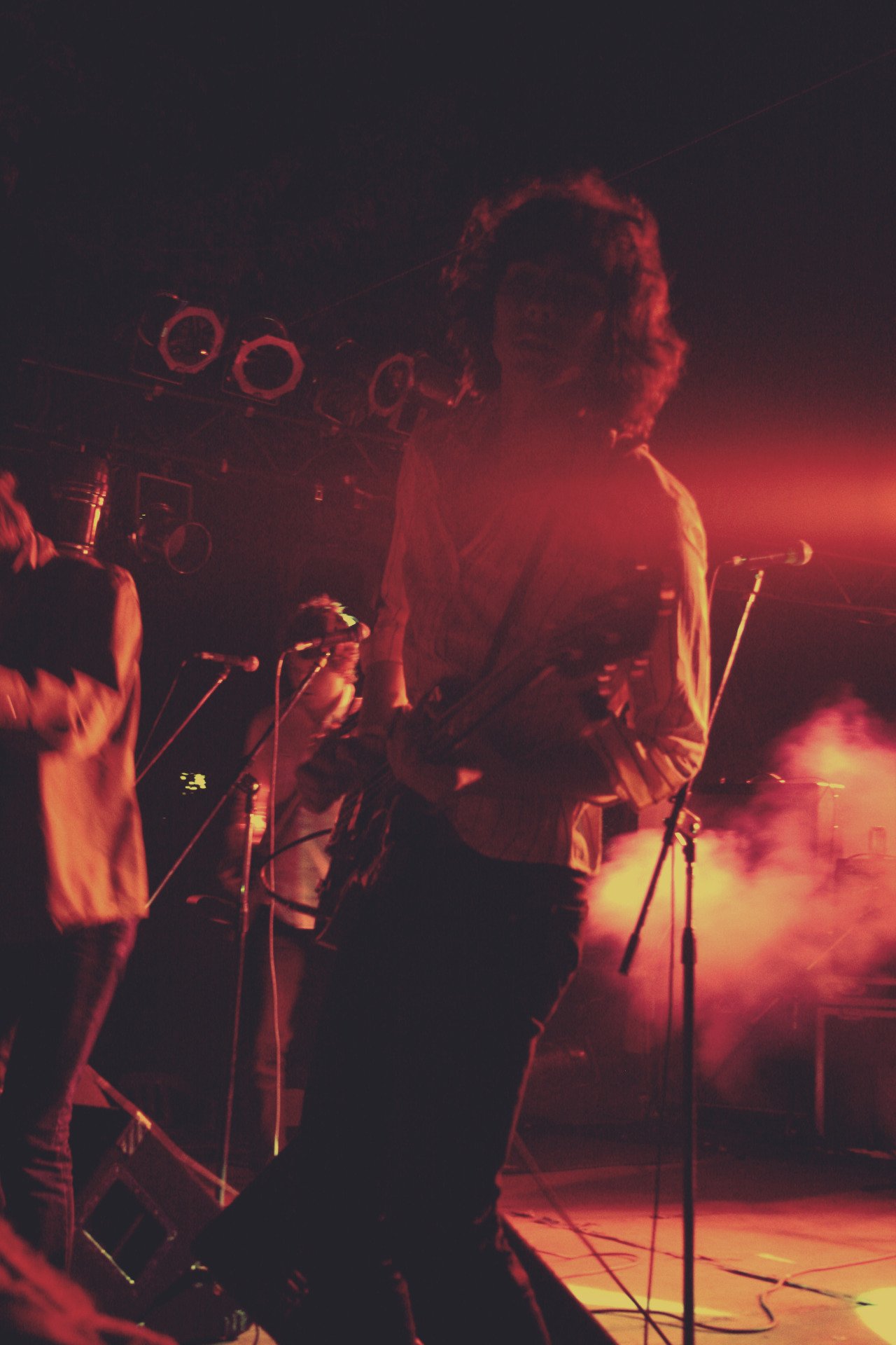 A musician with curly hair stands on stage under red lighting, holding a microphone, with other band members and smoke effects visible in the background.