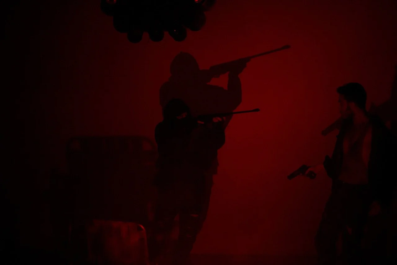 Silhouette of three people holding rifles against a red-lit background, with a faint outline of a chair and hanging ceiling decoration visible.