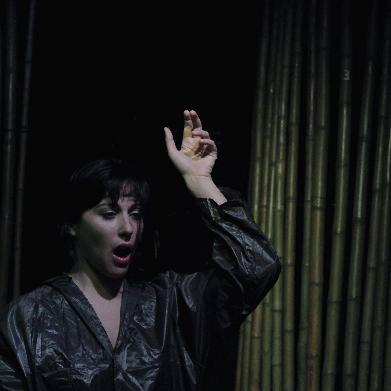 A woman with dark hair and a surprised expression, wearing a shiny black jacket, holding her left hand above her head against a dark background with bamboo stalks.