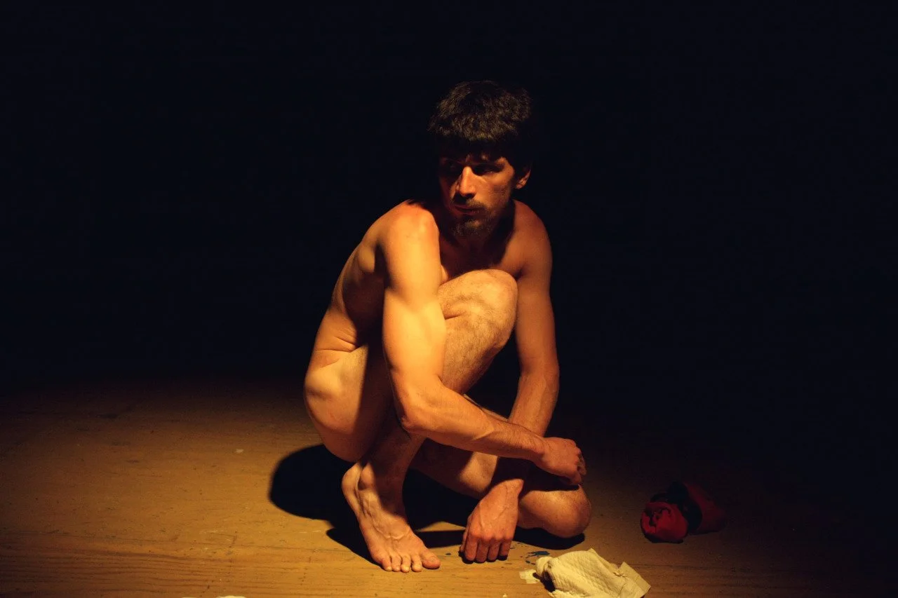 A man with dark hair and beard crouches on a wooden floor in a dark room, illuminated by a dim, warm light. He is nude, with a serious or contemplative expression, and is surrounded by a towel, socks, and a red and black item.
