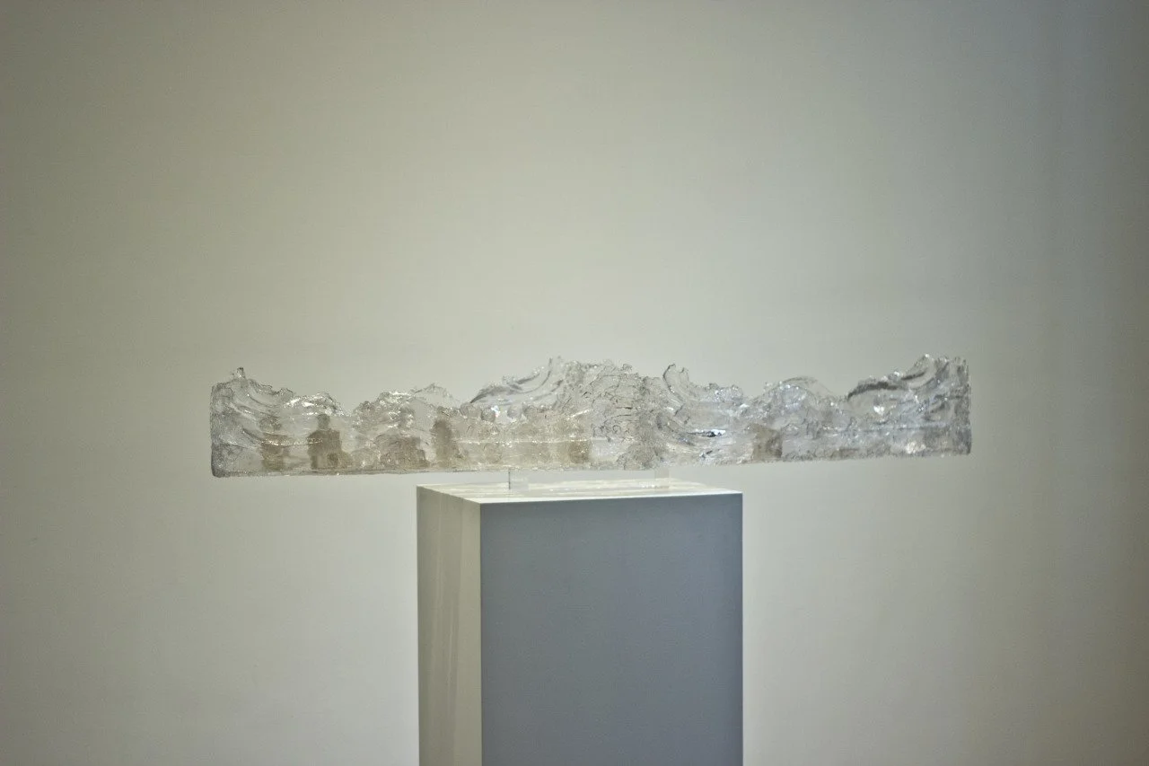 A clear, textured glass sculpture with wave-like patterns, displayed on a white pedestal against a beige wall.