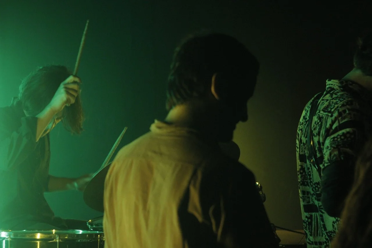 Three people playing musical instruments in a dimly lit room with green and yellow lighting.