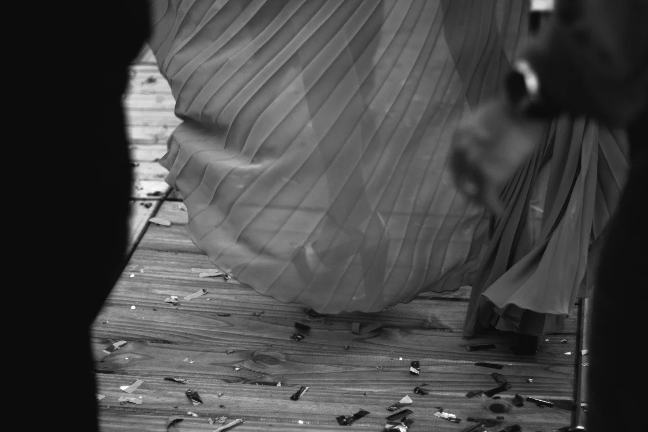 A person with a pleated dress standing on a wooden deck, next to scattered confetti and a black dog with glasses near the camera.