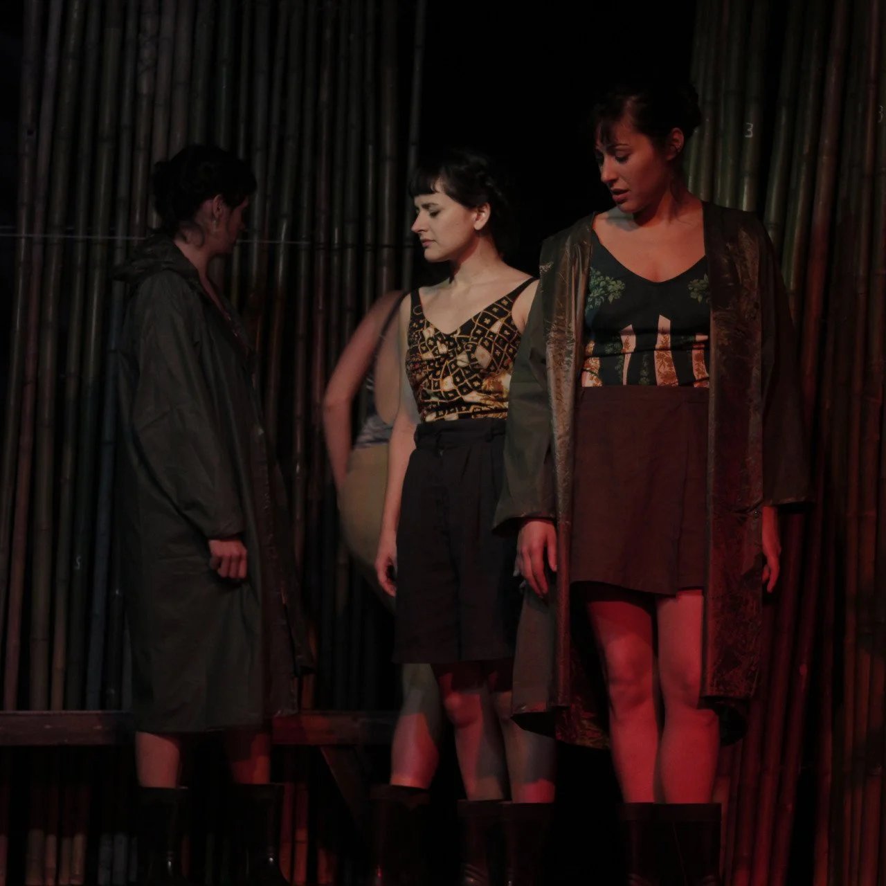 Three women standing on stage in front of a bamboo backdrop, dressed in casual clothing, appearing to be in a theatrical performance.