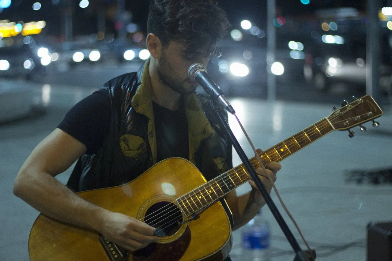 A young man with dark curly hair and a beard playing an acoustic guitar and singing into a microphone on a city street at night.
