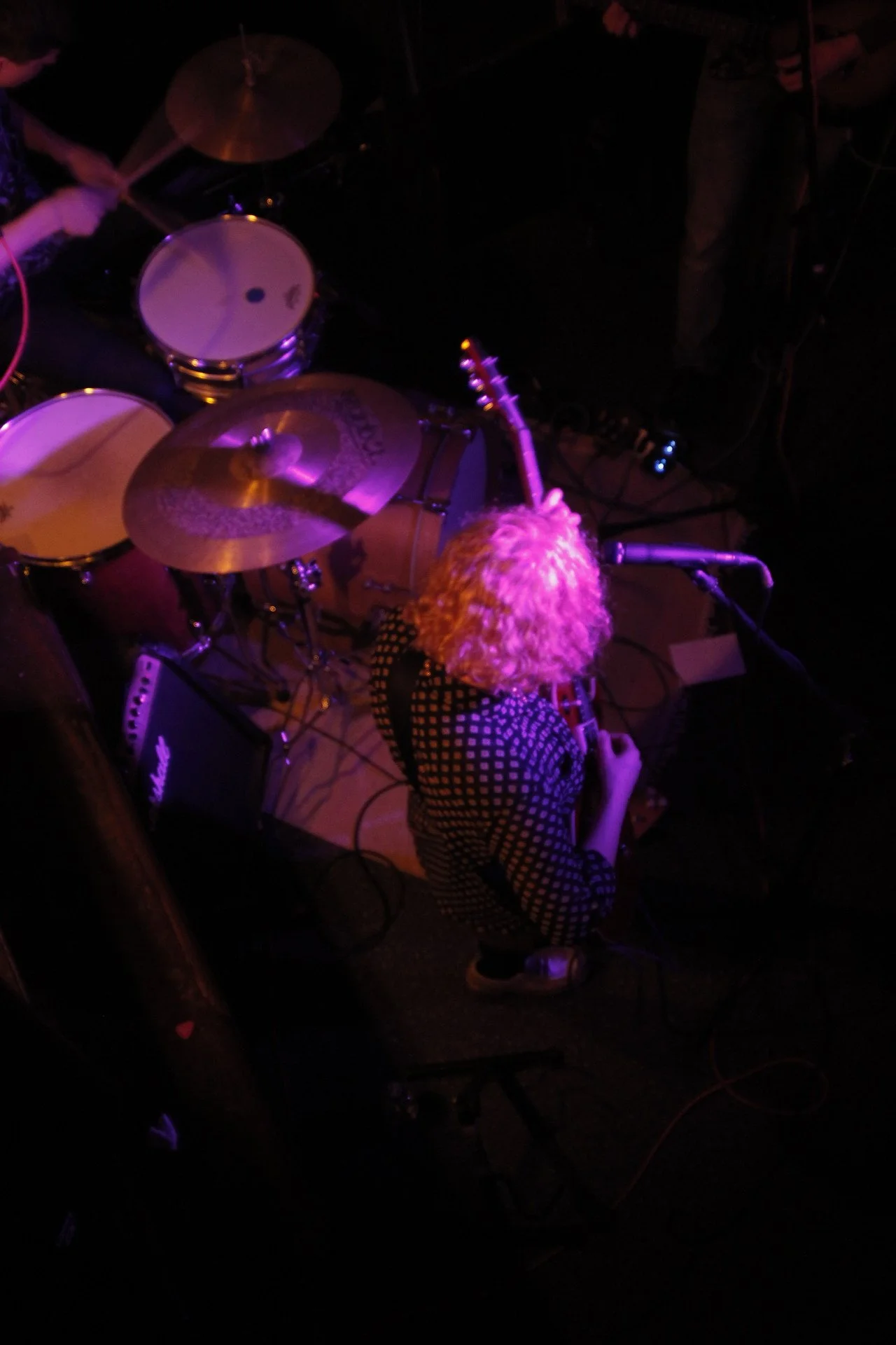 Overhead view of a woman with curly blonde hair playing drums and singing into a microphone on stage, with drums and cymbals visible, illuminated by purple stage lighting.