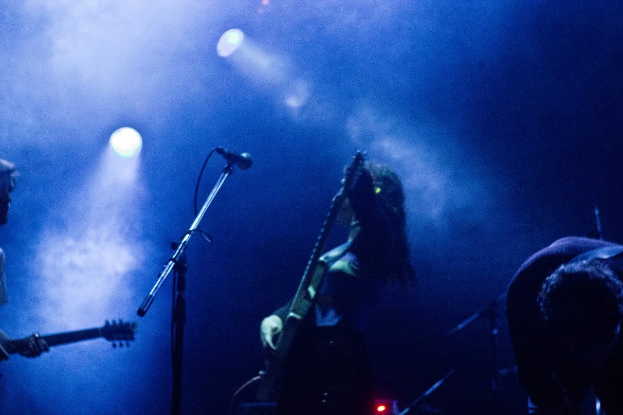 Musicians performing on stage with blue and purple lighting, one with long hair playing a guitar and singing into a microphone.