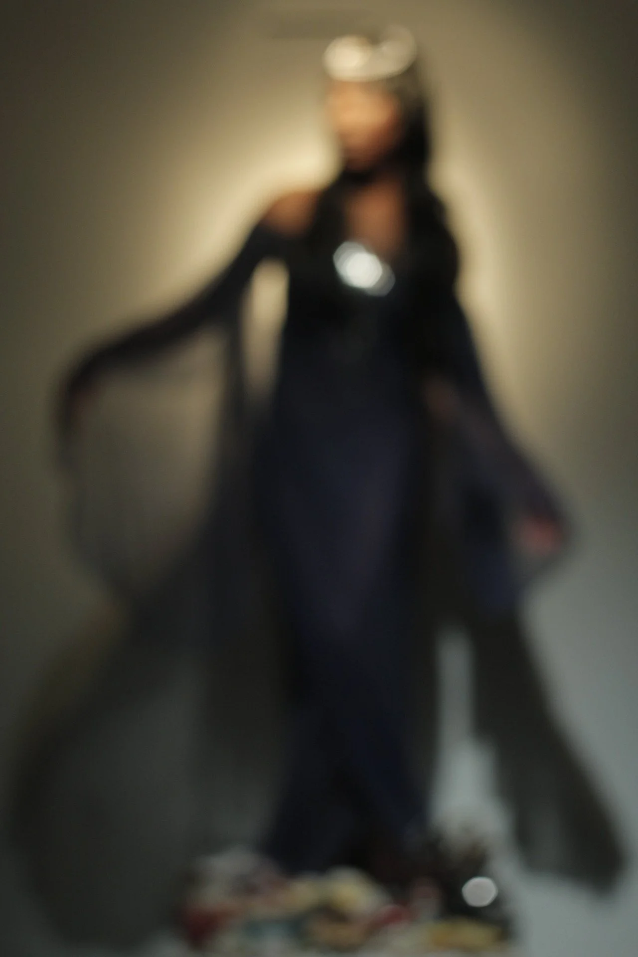 Blurry photo of a woman standing in front of a plain wall, wearing a hat and dark clothing.