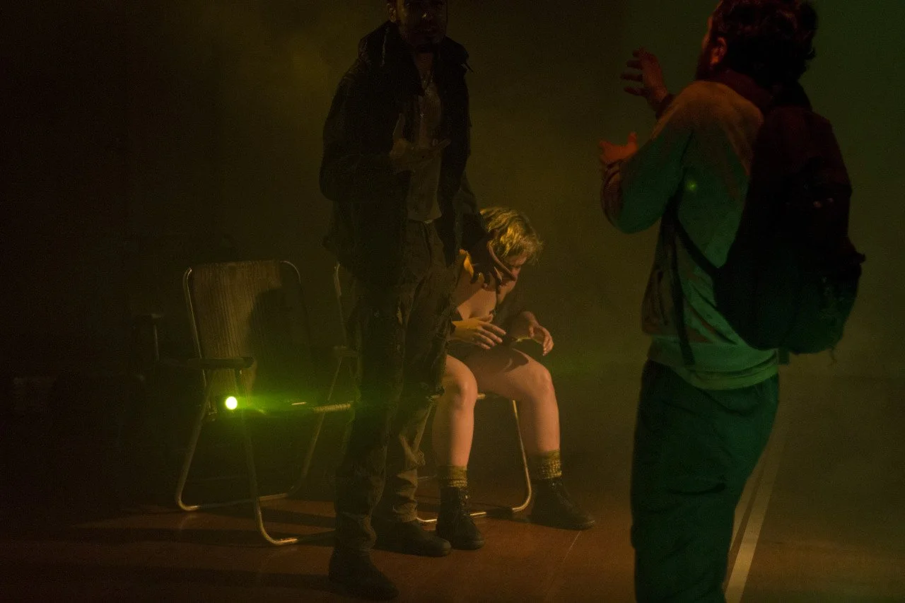 Three people in a dimly lit room with greenish lighting. One person is sitting on a chair, appearing nervous or distressed. Two others are standing nearby, one facing the seated person with hands in a gesturing motion, the other standing with a backp
