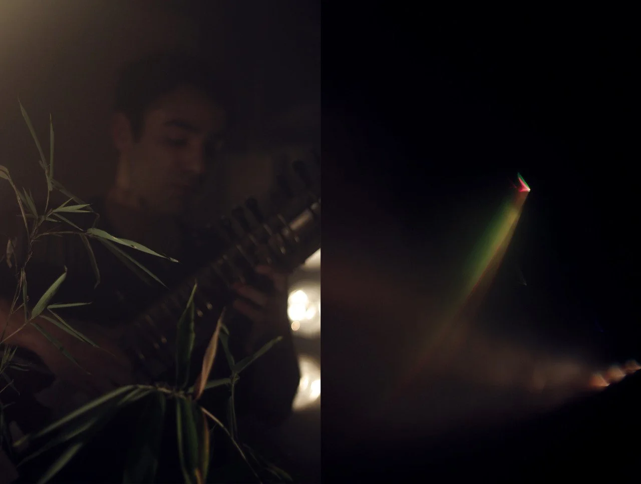 A person playing a guitar in dim lighting with leaves in the foreground and a colorful light streak in the background.