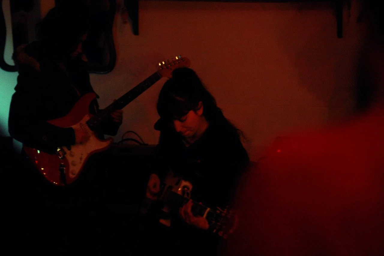 Two people playing electric guitars in a dimly lit room, with one person standing and the other sitting, surrounded by guitars and musical equipment.