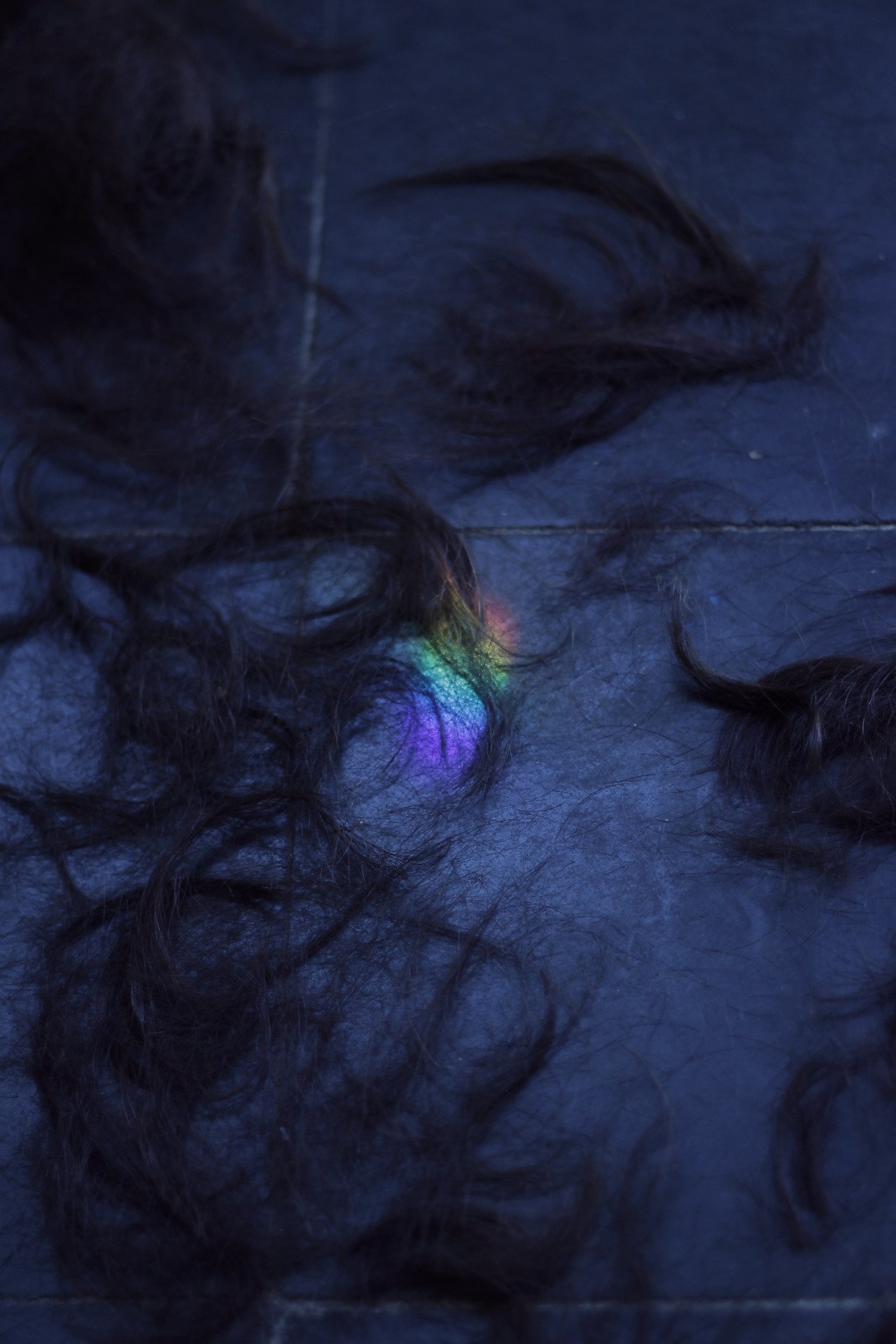 Colorful rainbow light reflecting on a black curly hair wig spread on a dark surface.