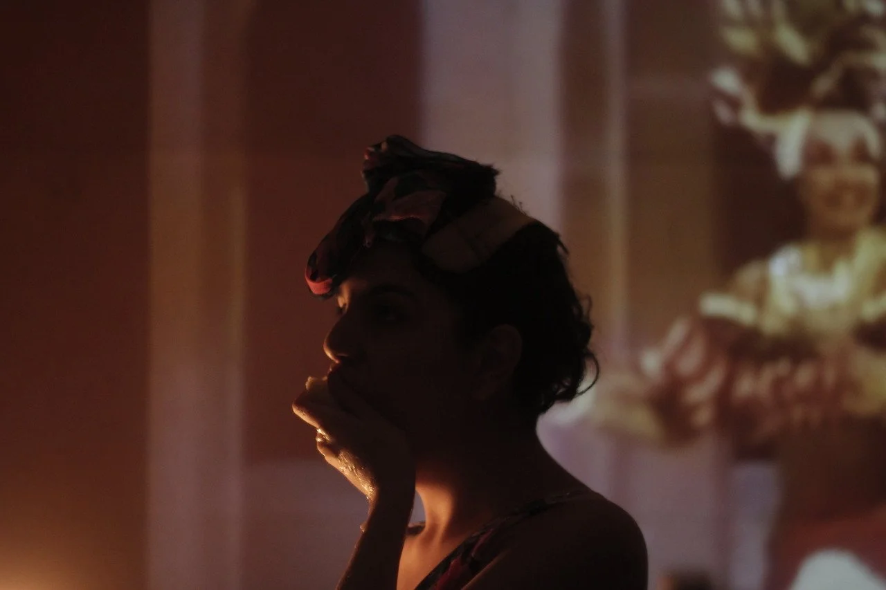 A woman in silhouette with a headwrap, her hand resting on her chin, in a warmly lit room with a blurred background and a projection of a picture of a woman in traditional clothing.