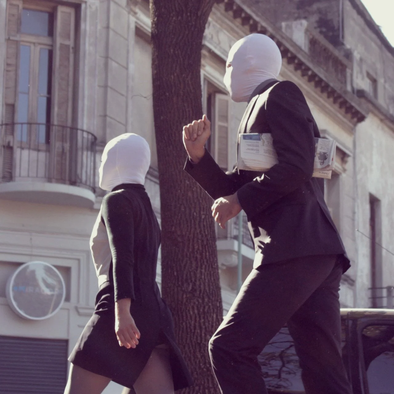 Two individuals wearing black suits with their faces covered by white masks walking on a city street.