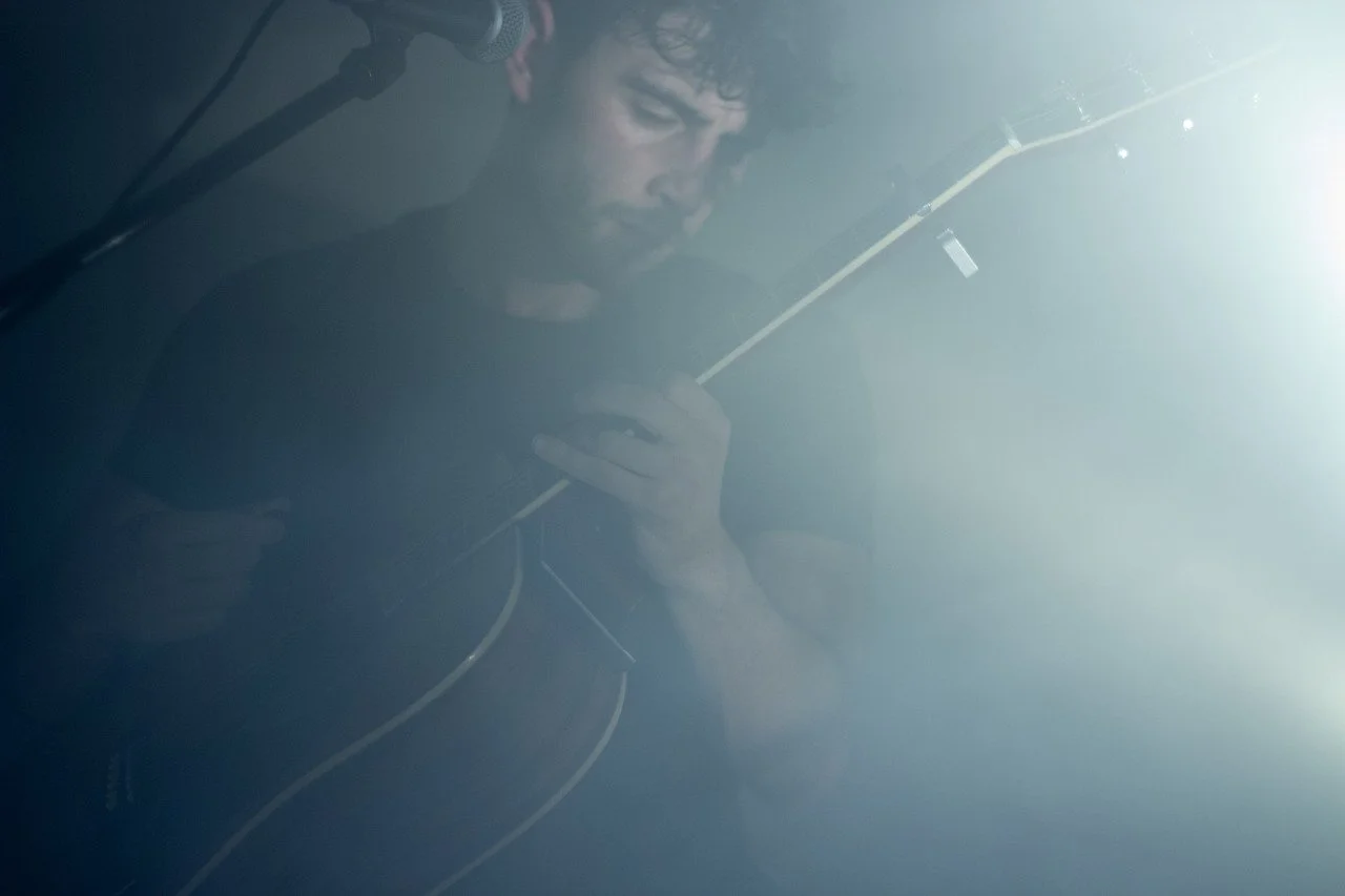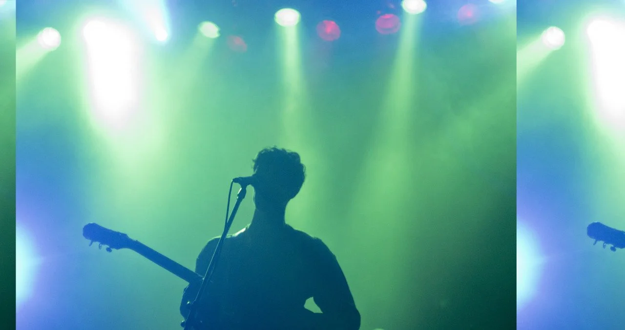 Silhouette of a person holding an acoustic guitar with a microphone in the background, with colorful stage lights creating a dark, moody atmosphere.