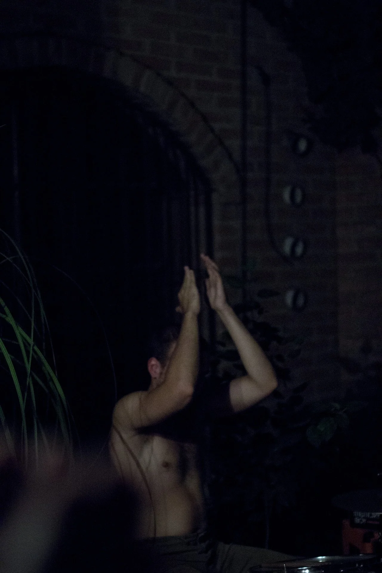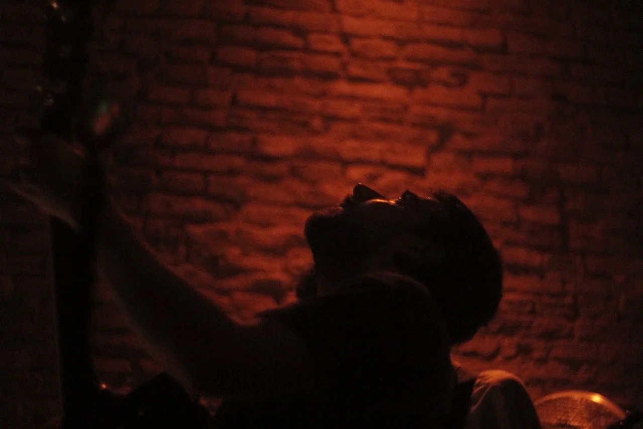 Silhouette of a person with head tilted back and eyes closed against a brick wall illuminated by warm orange light.