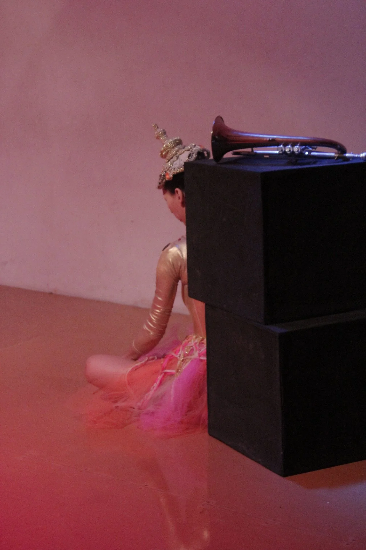 A dancer sitting on the floor dressed in a shiny gold and pink costume with an ornate headpiece, with a trumpet resting on a black stand nearby, in a room with pink lighting.