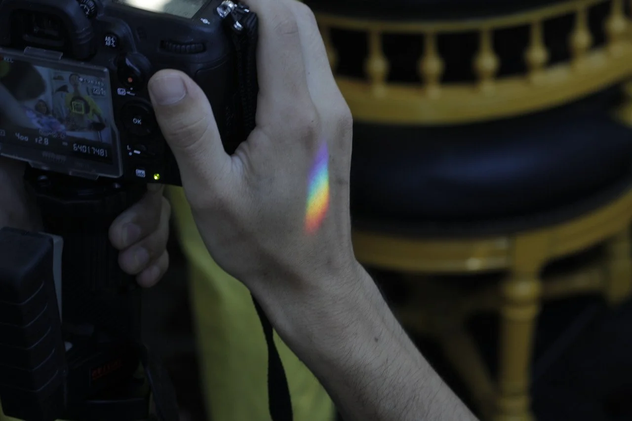 A person holding a camera, with a rainbow-colored light reflecting off their hand onto the camera strap.