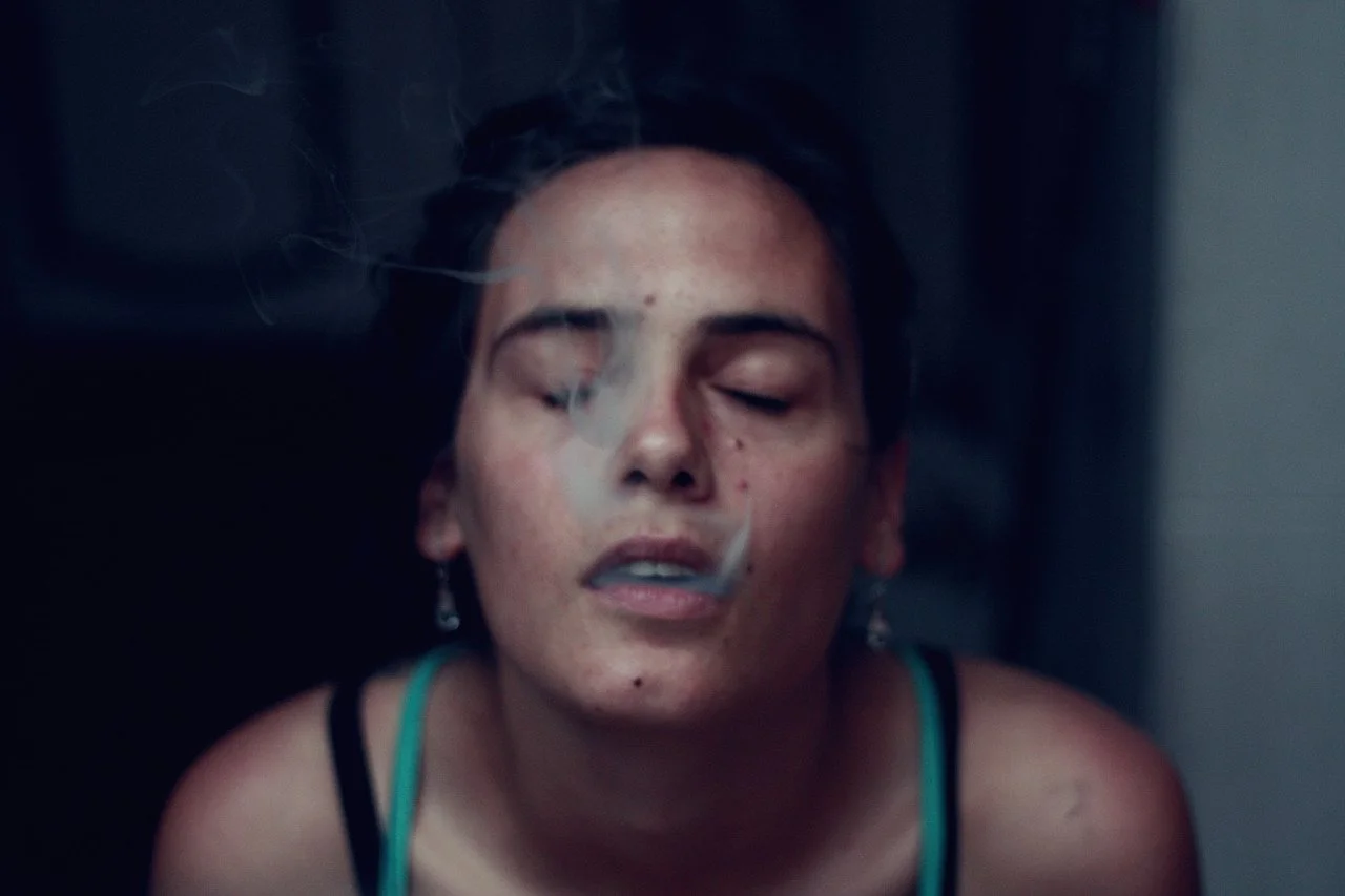 Close-up of a woman with closed eyes, smoking a cigarette with smoke swirling around her face.