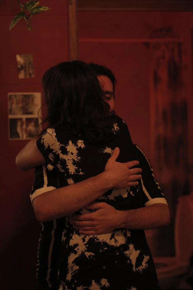 Two people, a man and a woman, hugging each other in a dimly lit room with red lighting.