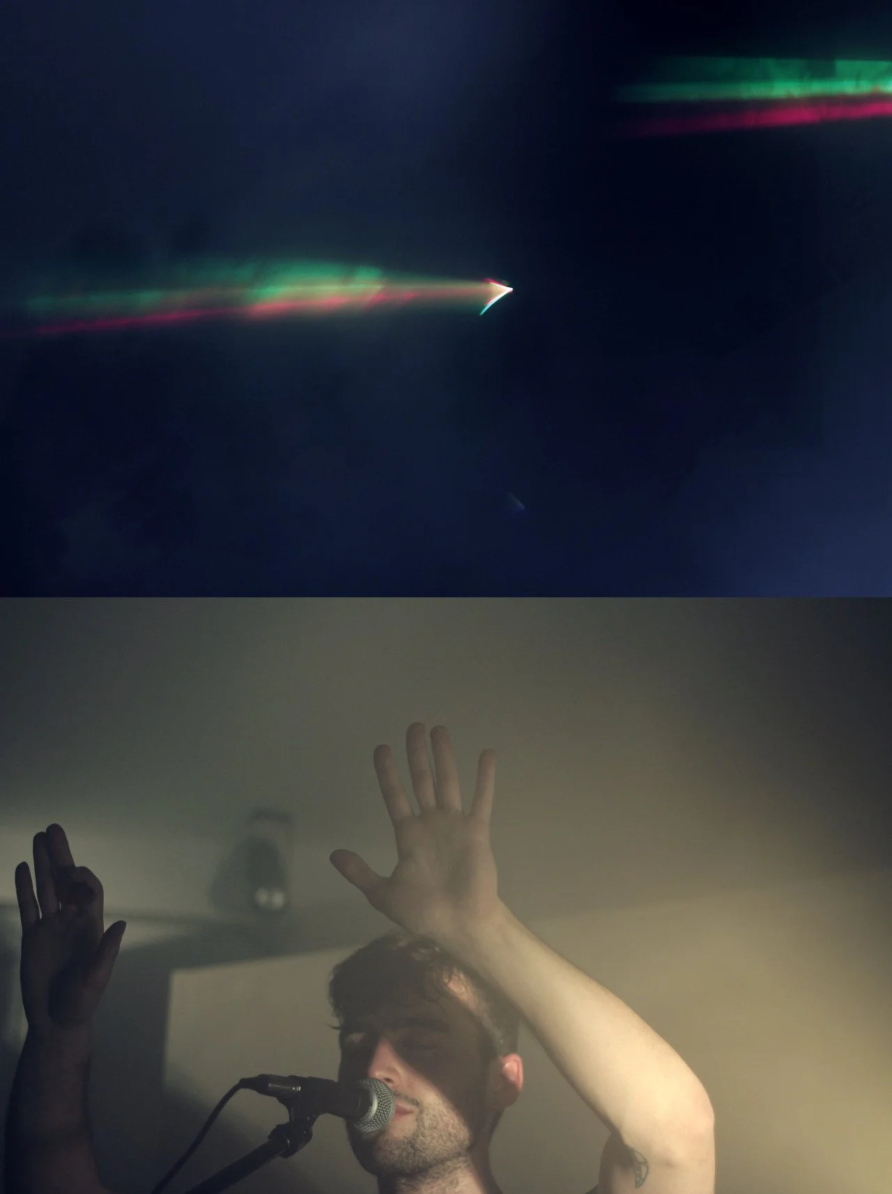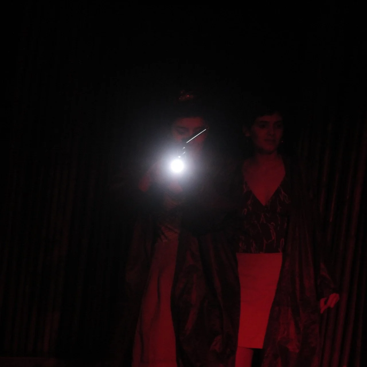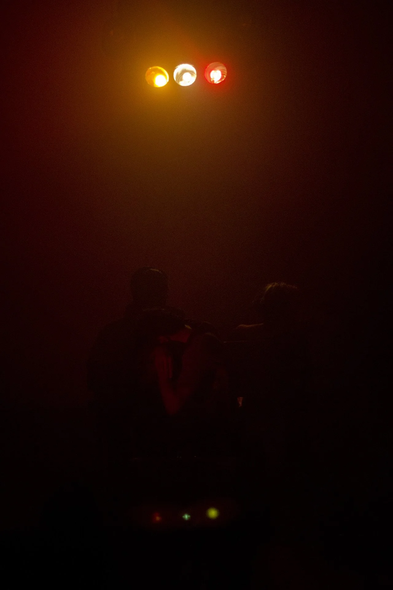 Dark image with two people silhouetted under red, yellow, and white stage lights, in a dimly lit environment.