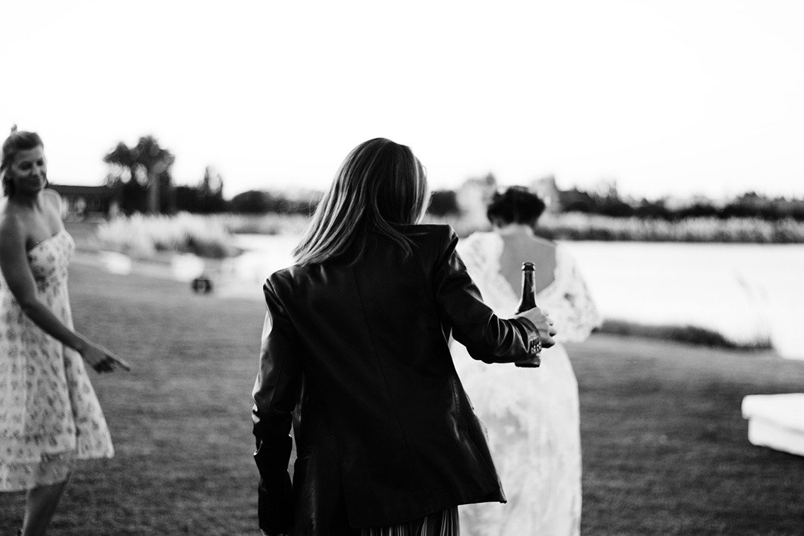 Woman in leather jacket holding a beer bottle near a lake with two women in summer dresses in the background.
