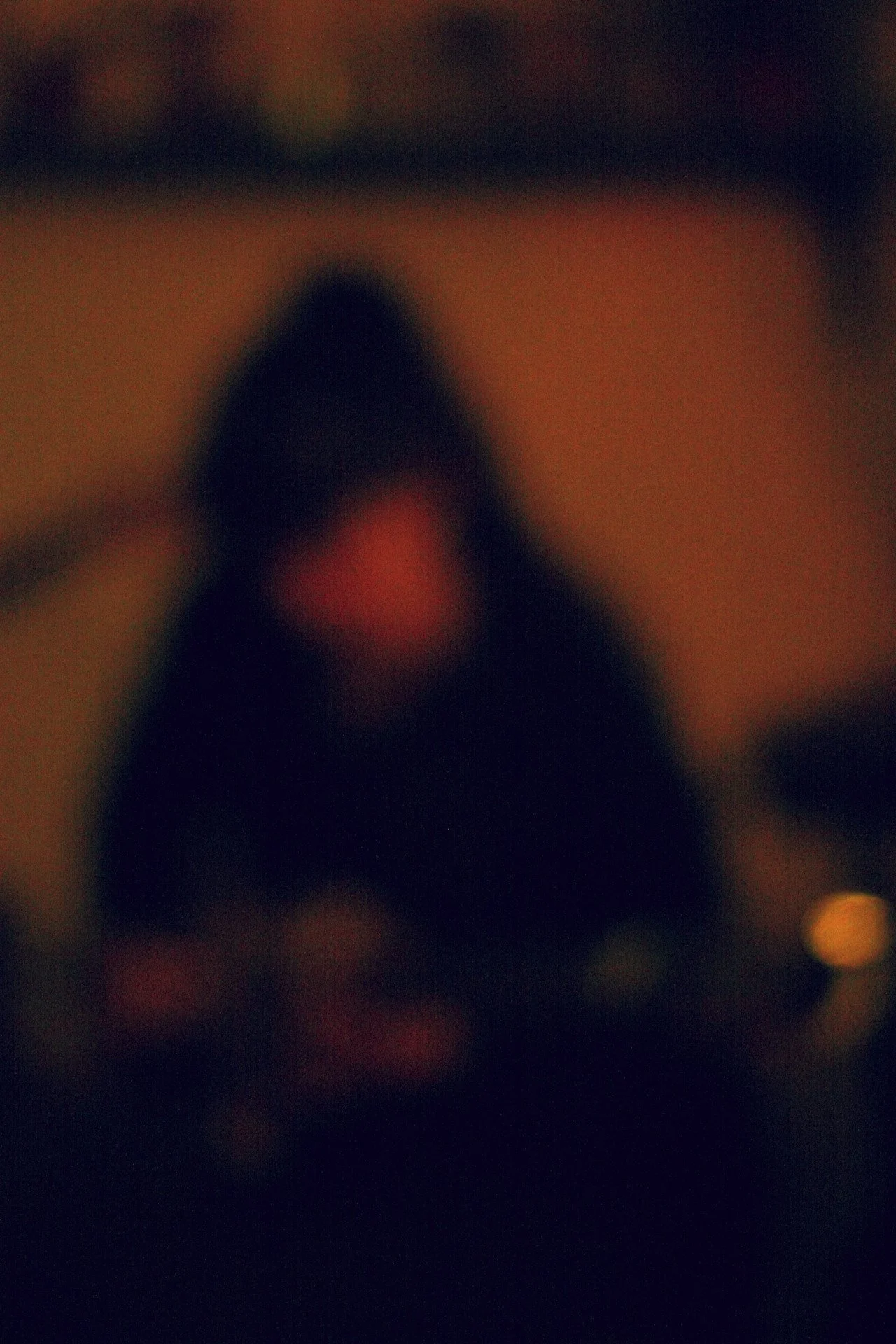 A blurry image of a person wearing a dark hooded jacket, standing indoors near a wall.