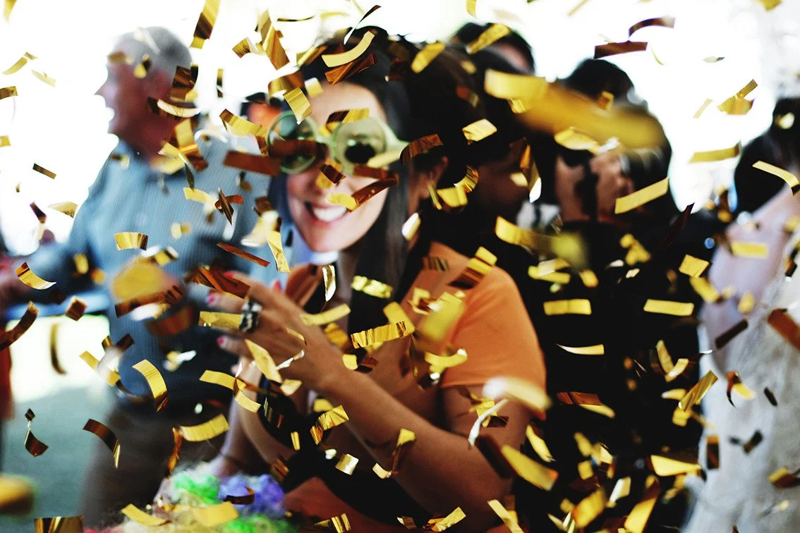 People celebrating with gold confetti falling, smiling, and enjoying a party or event.