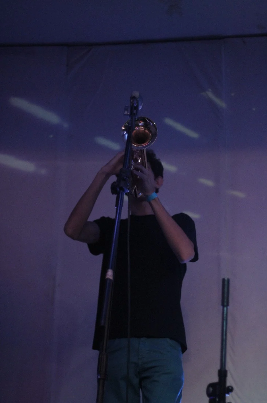 Person playing trumpet in a dimly lit room with purple and blue lighting effects.