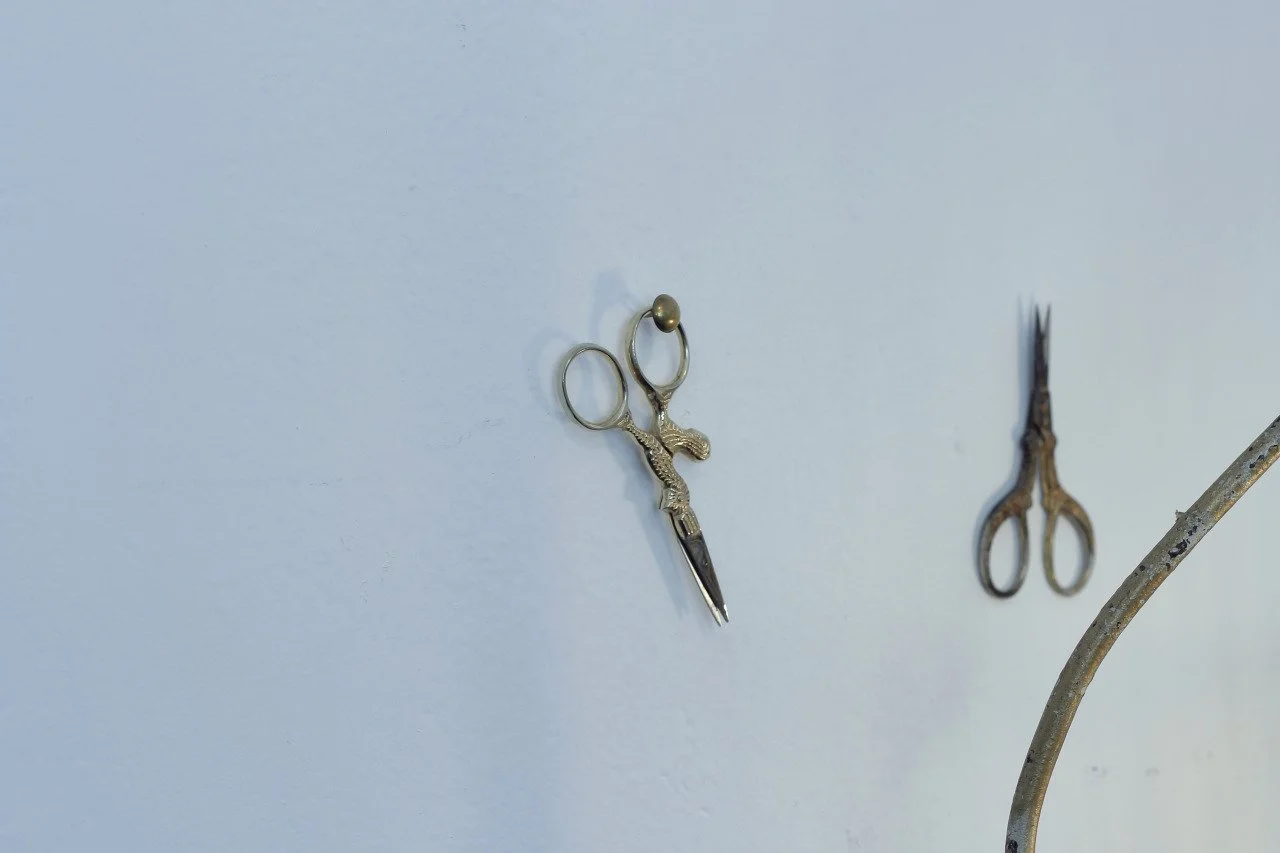 A pair of small, ornate scissors with a dragon design on the handle and a larger pair of scissors with black tips, both mounted on a light-colored wall, with a curved metal rod in the lower right corner.