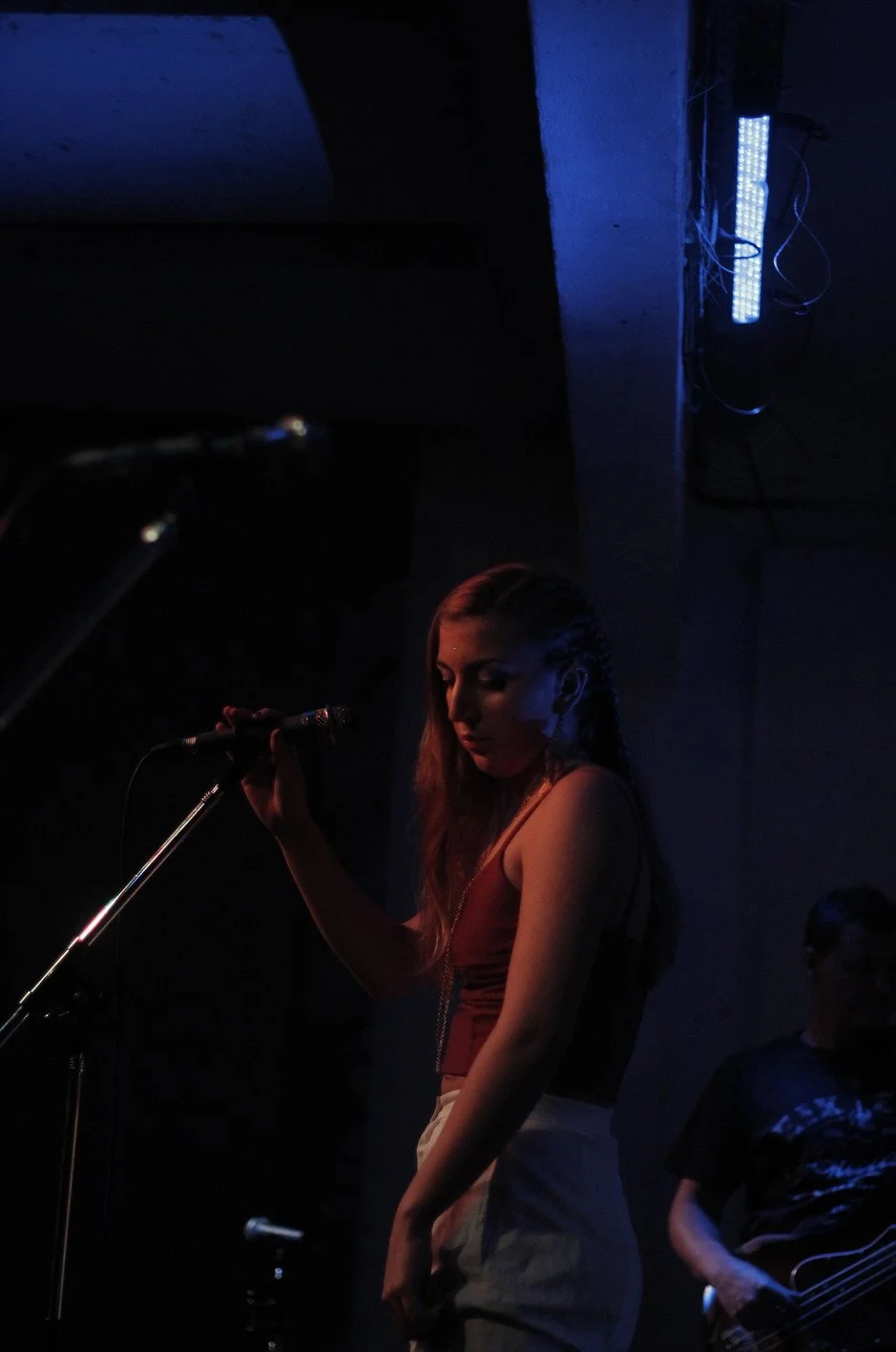 A woman with long hair in a sleeveless top holding a microphone in a dimly lit room, with a man playing guitar in the background near a blue light.