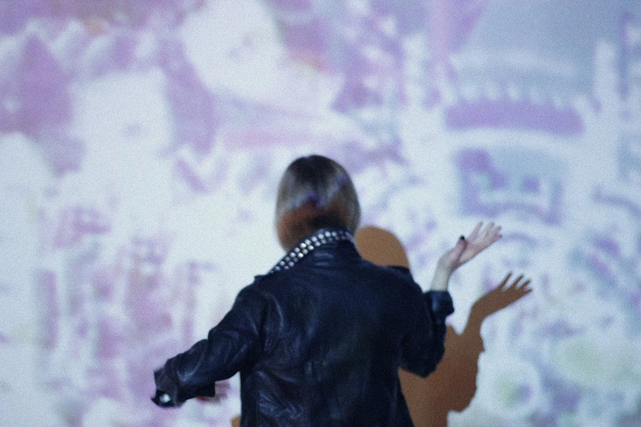 Person with short hair wearing a black leather jacket with silver studs, standing with their back to the camera, in front of a colorful abstract background projected onto a wall.