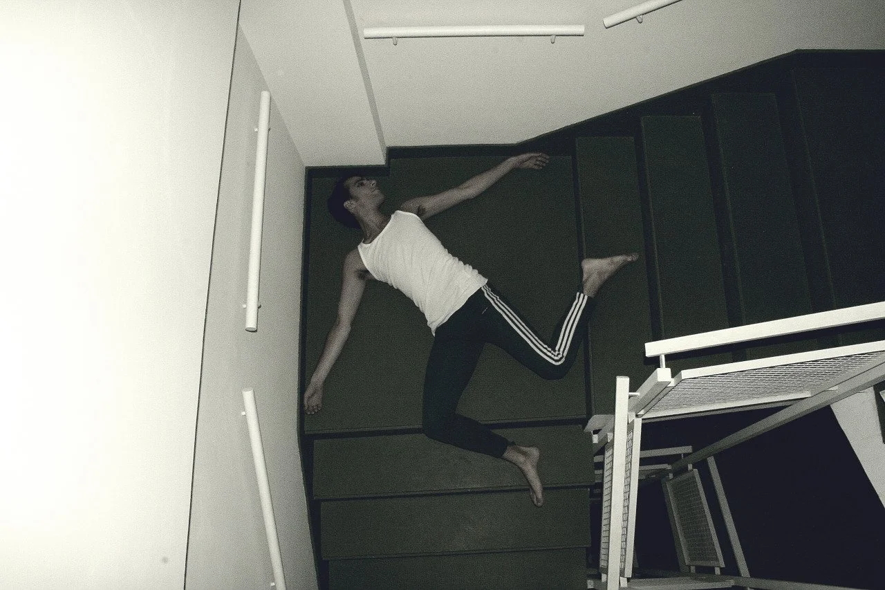 A black-and-white photograph of a woman with arms raised, her shadow projected on a wall behind her showing multiple mirrored images.