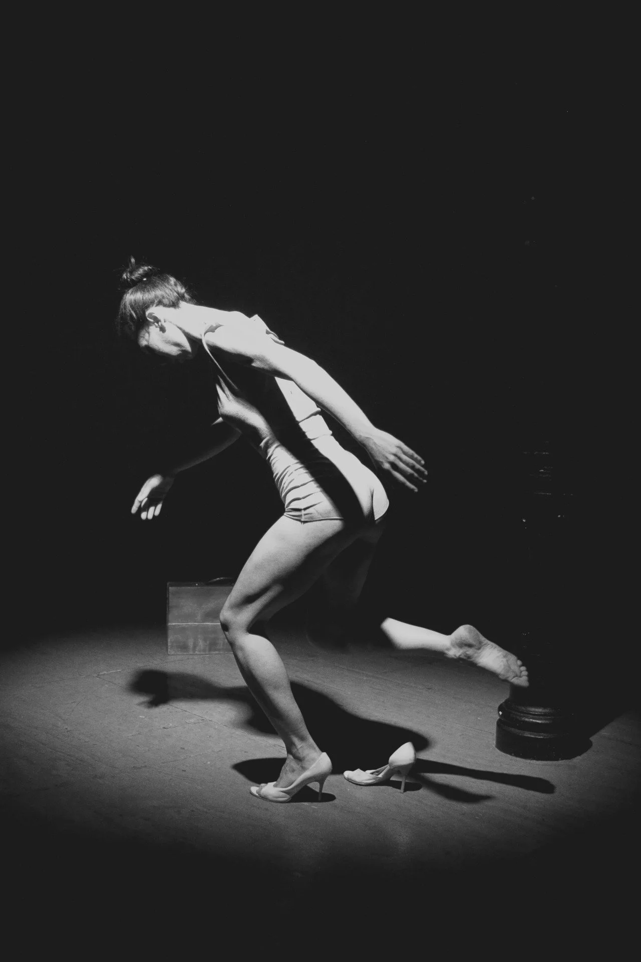 A woman in a dress and high heels performing on stage in black and white, with dramatic lighting and shadows.