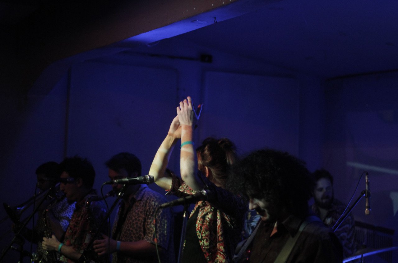 Musicians on stage with dark blue lighting, one woman with her hands raised clapping, others playing instruments.