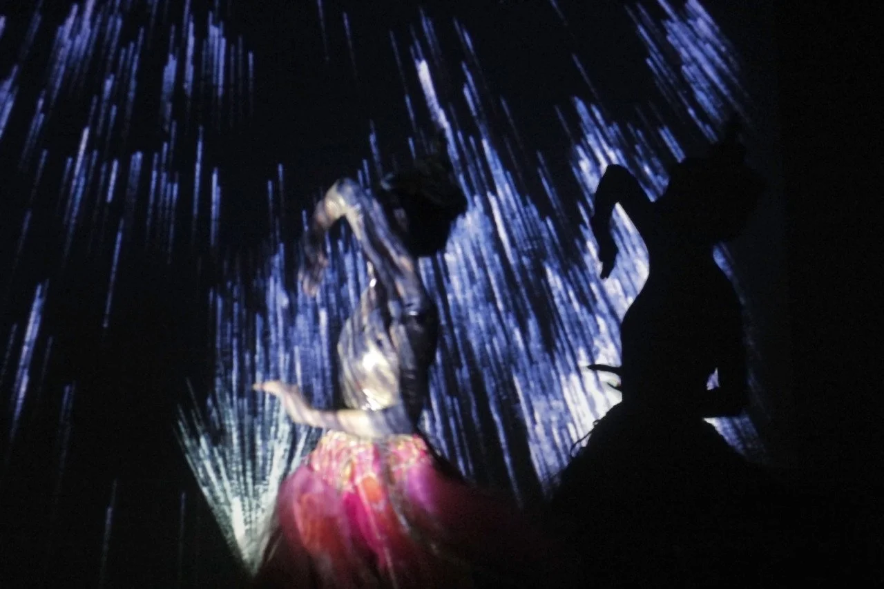 Silhouettes of two dancers against a backdrop of colorful light streaks and abstract patterns, creating a dynamic and artistic visual scene.