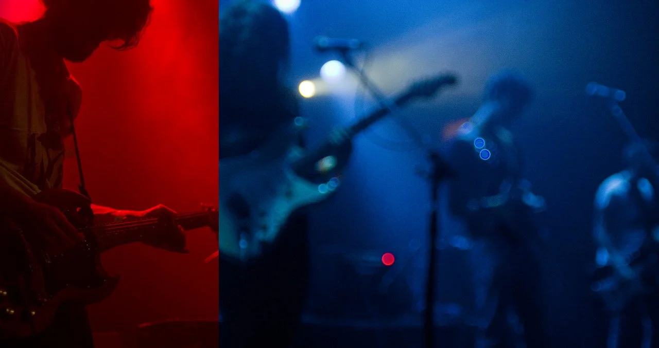A person playing a guitar on stage bathed in red light, with two other blurred musicians in the background under blue lighting.