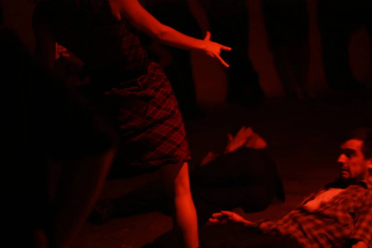 A person lying on the floor with another person leaning over them in a dimly lit red room, possibly a stage or nightclub.