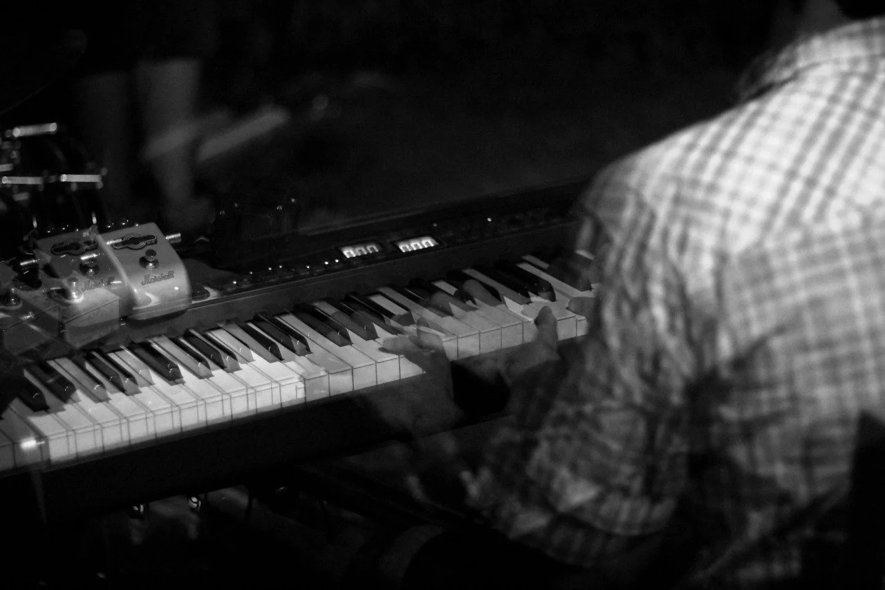 Black and white photo of a person playing a keyboard with visible piano pedals and synth controls, wearing a checkered shirt.