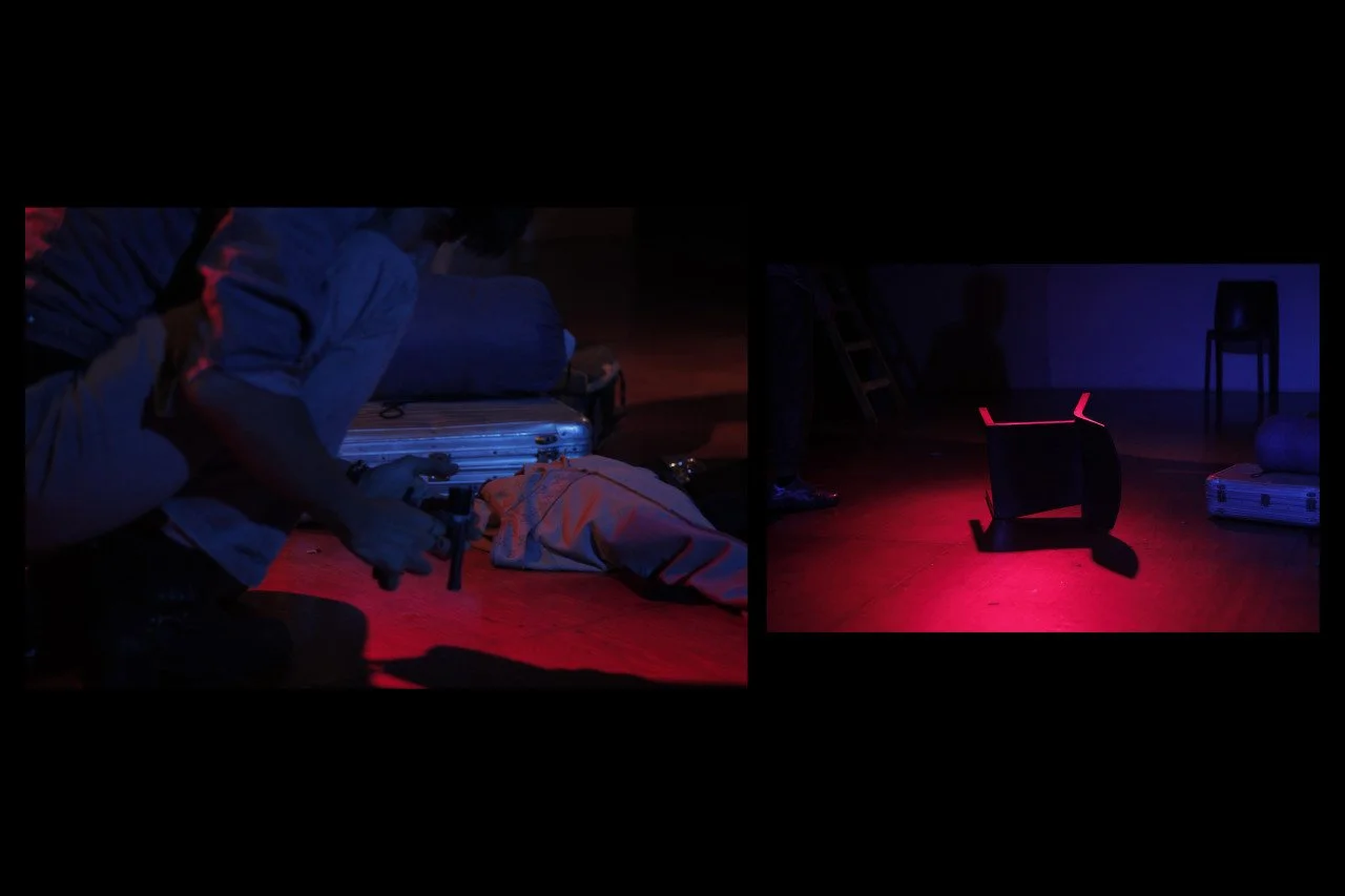 Dark scene with two sections illuminated by red and purple lighting. The left side shows a person lying on the floor with a suitcase and some objects, surrounded by darkness. The right side shows a small chair with glowing red edges on the floor, wit
