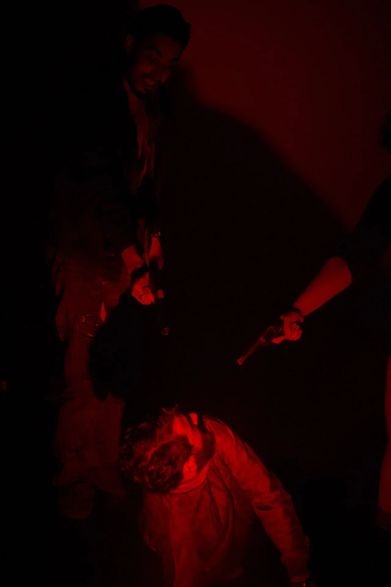 A person with a beard and smiling face wearing a scarf, standing in a dark room illuminated by red light, holding an object. Another person is seated or crouched in front, wearing glasses and a hoodie, with their head lowered.