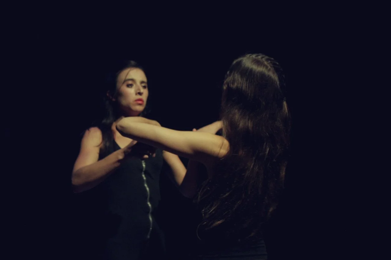 Two women with dark hair engage in a theatrical scene against a black background, with one woman holding the other by the shoulders.